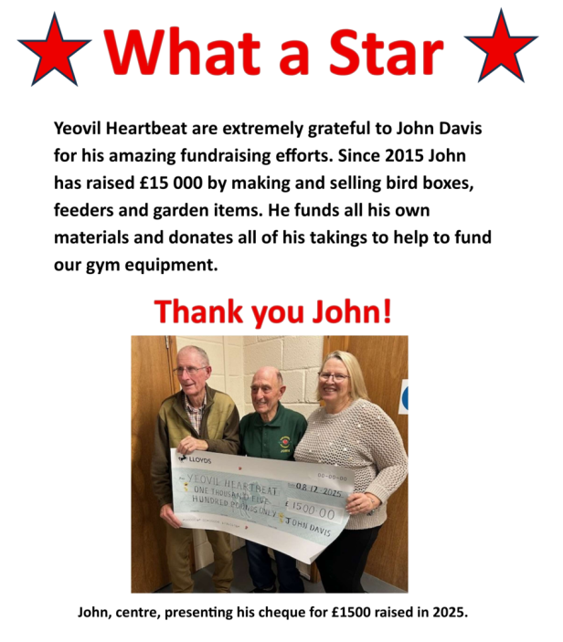 Yeovil Heartbeat is immensely grateful to John Davis for his amazing fund raising efforts.